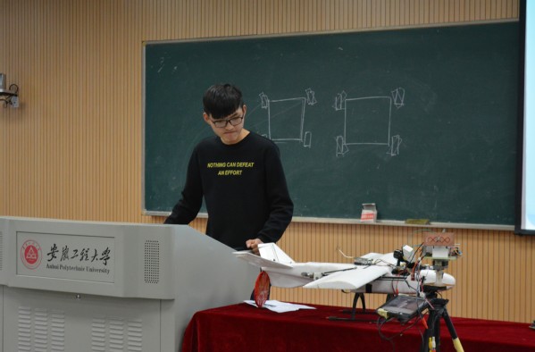 终审于近日在5教116教室举行,由来自机械和电气两个学院的七位专家担任评委。十二件参赛作品的负责人依次上台,通过PPT向评委及在场观众详细讲述每件作品的制作背景、基本功能、创新创意及改进之处,并结合实物进行针对性阐释和功能现场演示,各位评委根据每件作品的设计理念及功能赋予从不同专业角度进行了详细的提问和质询。选手与评委之间的精彩互动及作品现场的精彩演示赢得了在场观众的阵阵掌声。其中,参赛作品“复合翼垂直起降无人机”的展示将比赛带向了高潮,选手通过视频向所有人展示了无人机实际飞行的姿态。最后,机械学院副院长高洪教授代表评委进行点评,他对所有参赛人员及其作品的创新性进行了高度表扬,也对各个作品的不足之处提出了自己的意见及改进方式。