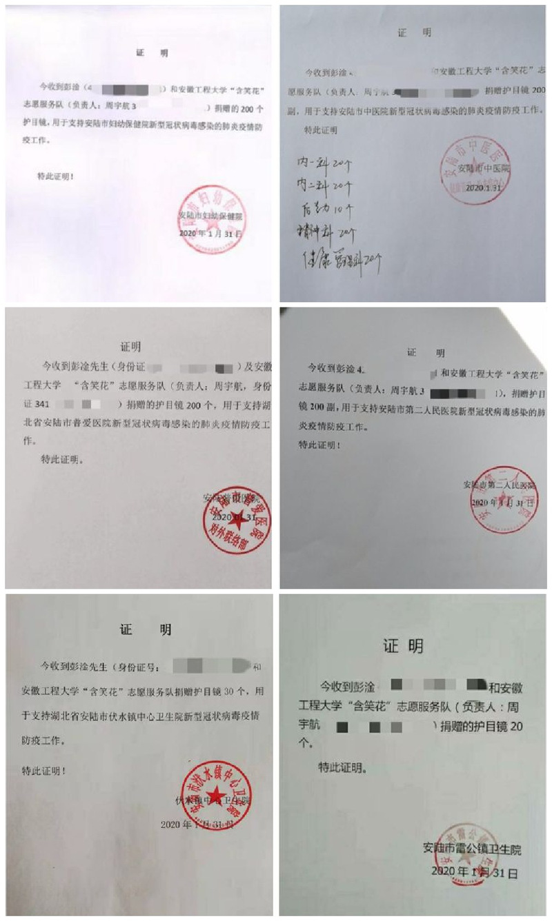 截止2020年2月1日10:00,本次募捐总额达到45505.94元,参与募捐人数2521余人。目前团队已分别向湖北省安陆市普爱医院、安陆市第二人民医院、安陆市中医院、安陆市妇幼保健院、安陆市李店镇卫生院、孝昌县妇幼保健院共捐赠1000个医用护目镜、730只医用口罩、300套医用防护服、200支乙醇消毒液、20瓶免洗手消毒液。