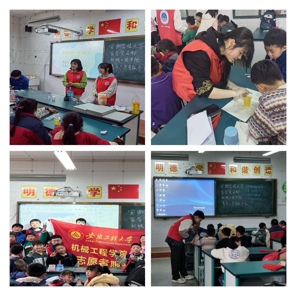 以青春之名,传雷锋精神。宣讲结束后,院青年志愿者服务队成员开始了科普实验活动。他们用简单质朴语言详细介绍了“果汁分你一半”、“逆行的羽毛球”、“水中站立的牙签”等趣味实验的原理,并亲自指导小朋友们来动手完成,以此激发他们的学习兴趣。期间,装备专业学生党支部成员积极协助,解答小朋友们的疑问。