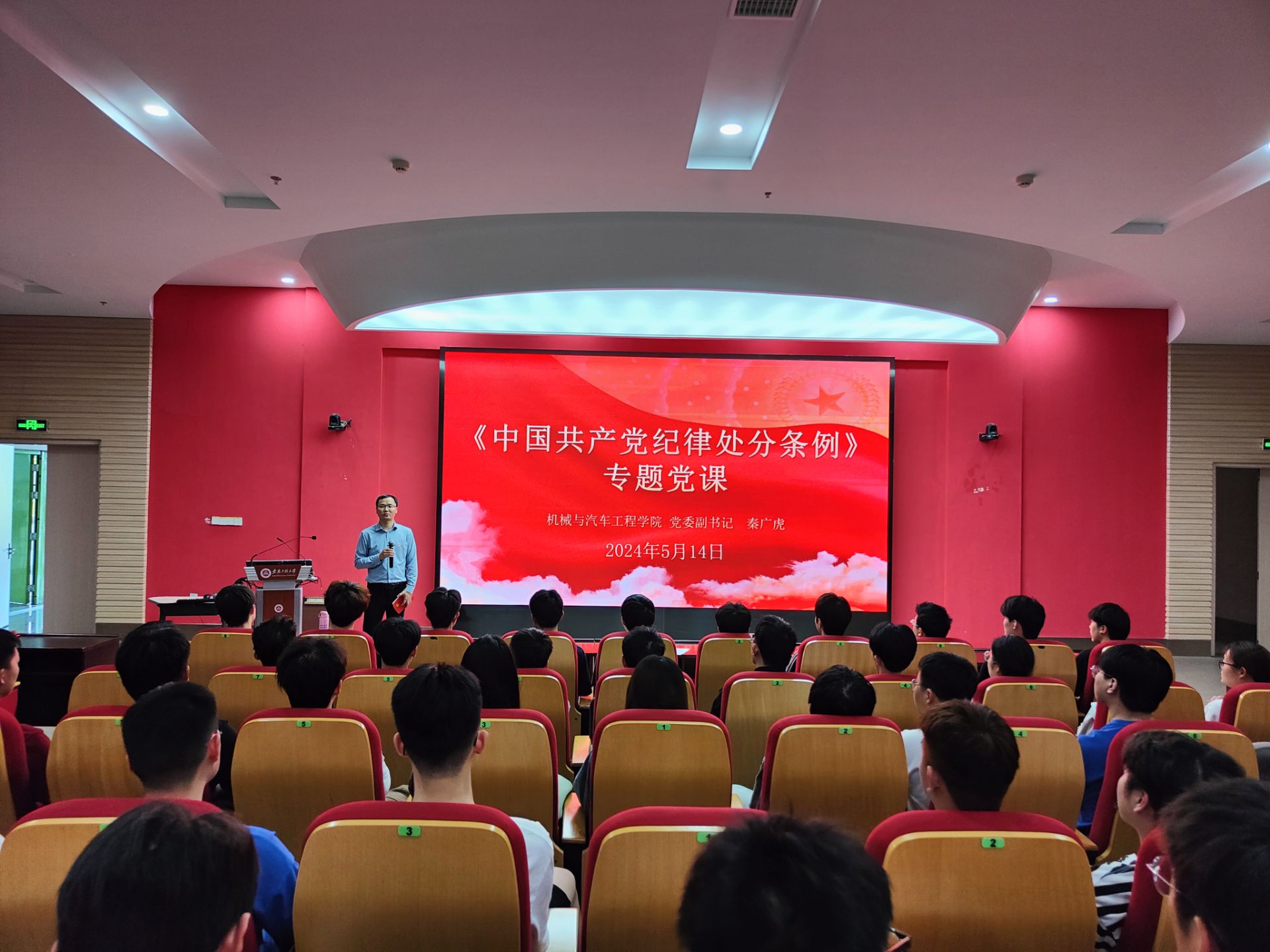 515日,yl23455永利官网书记秦广虎以“学纪、知纪、明纪、守纪”为题在国际工程师学院校区梦溪报告厅为本科生党支部上《中国共产党纪律处分条例》专题党课。机制专业学生第一党支部、机制专业学生第二党支部、测控专业学生党支部、车辆专业学生第一党支部、车辆专业学生第二党支部、交通工程专业学生党支部、机电专业学生党支部党员代表参加此次党课。