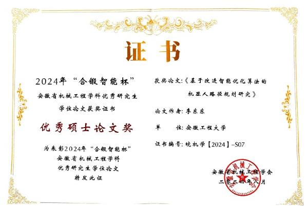 8月30日,安徽省机械工程学会第十次会员代表大会在合肥召开。安徽省机械工程学会开展了优秀研究生学位论文奖评选活动,来自中国科学技术大学研究生院科学岛分院、合肥工业大学、安徽大学、安徽工程大学等10名研究生获得2024年“合锻智能杯”安徽省机械工程学科优秀研究生学位论文奖,其中博士学位论文奖3篇、硕士学位论文奖7篇。会议期间,中国工程院院士陈学东、合肥合锻智能制造股份有限公司董事长严建文为获奖者颁奖。yl23455永利官网2023届毕业研究生李东东同学的硕士学位论文《基于改进智能优化算法的机器人路径规划研究》(导师:王雷教授)获得优秀硕士论文奖。