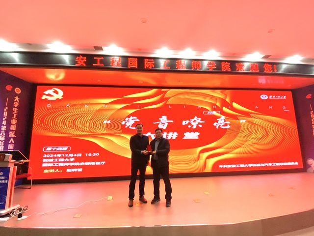 赵转哲老师围绕新质生产力的来源与内涵、人工智能的定义、人工智能如何赋能新质生产力、青年大学生如何规划自己的未来人生等四个方面,结合语音智能鼠标、动作识别、智能车辆、智能机器人等应用实例,以生动有趣的方式为大家提供了一场人工智能赋能新质生产力的知识盛宴。他结合个人成长经历勉励在场同学要积极认识、拥抱人工智能,赋能自己,赋能专业;要协调好人际关系,具备团队精神;要脚踏实地,做好每一件事,静待花开。秦广虎代表学院为赵老师颁发“党音嘹亮”大讲堂名师工作室讲师团纪念徽章。