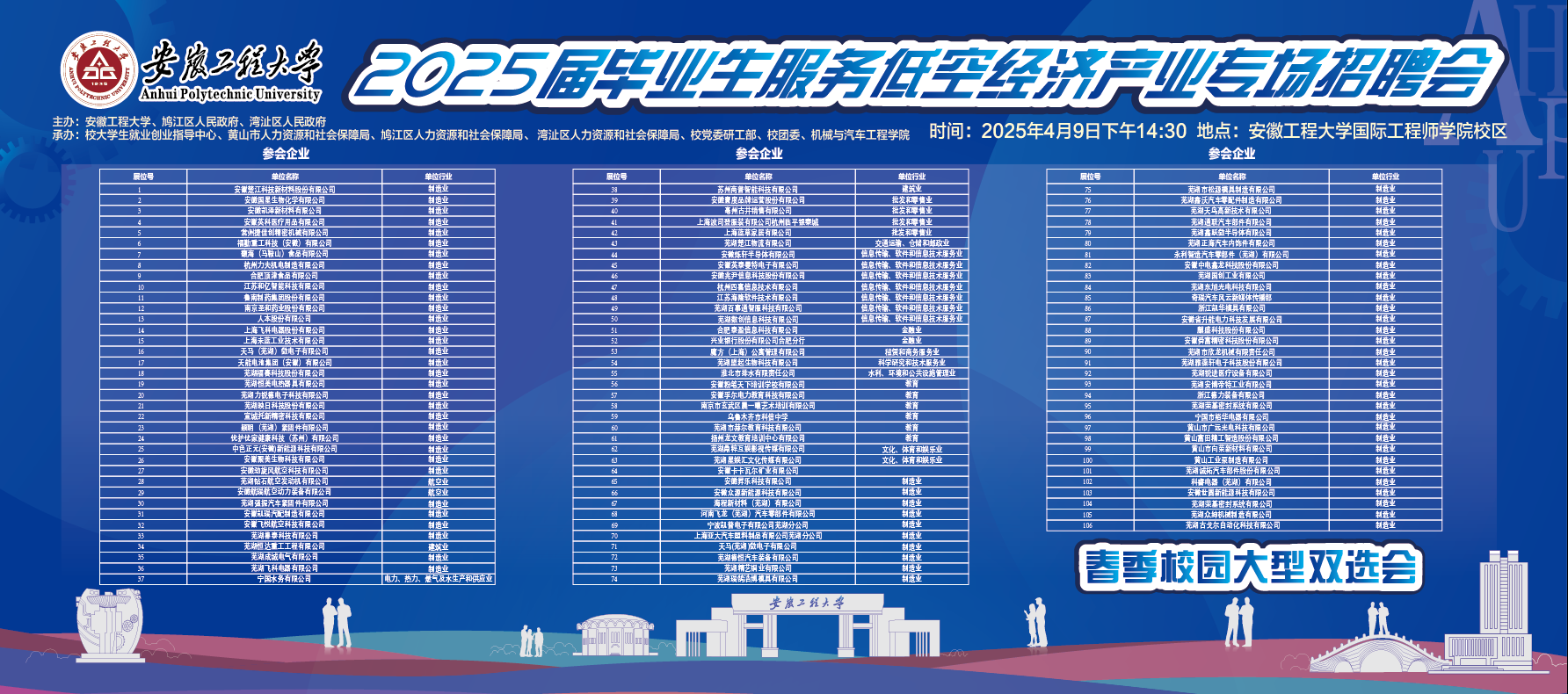为持续推进毕业生就业服务工作,4月9日,2025届毕业生服务低空经济产业专场招聘会在国际工程师学院校区举行。本次招聘会由安徽工程大学、鸠江区人民政府、湾沚区人民政府主办,校大学生就业创业指导中心、校党委研工部、校团委、yl23455永利官网承办,来自省内外100余家用人单位来校招聘人才。