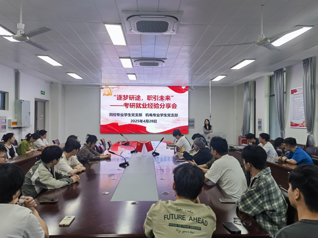 为充分发挥学生党支部的战斗堡垒作用,帮助低年级同学明确未来发展方向,掌握考研与就业的实用技巧。4月28日,测控专业学生党支部联合机电专业学生党支部在国际工程师学院校区实训楼3-1-204会议室开展考研就业经验分享会,支部党员、2022级和2023级部分学生参与其中。活动由测控专业学生党支部书记时慕天主持。