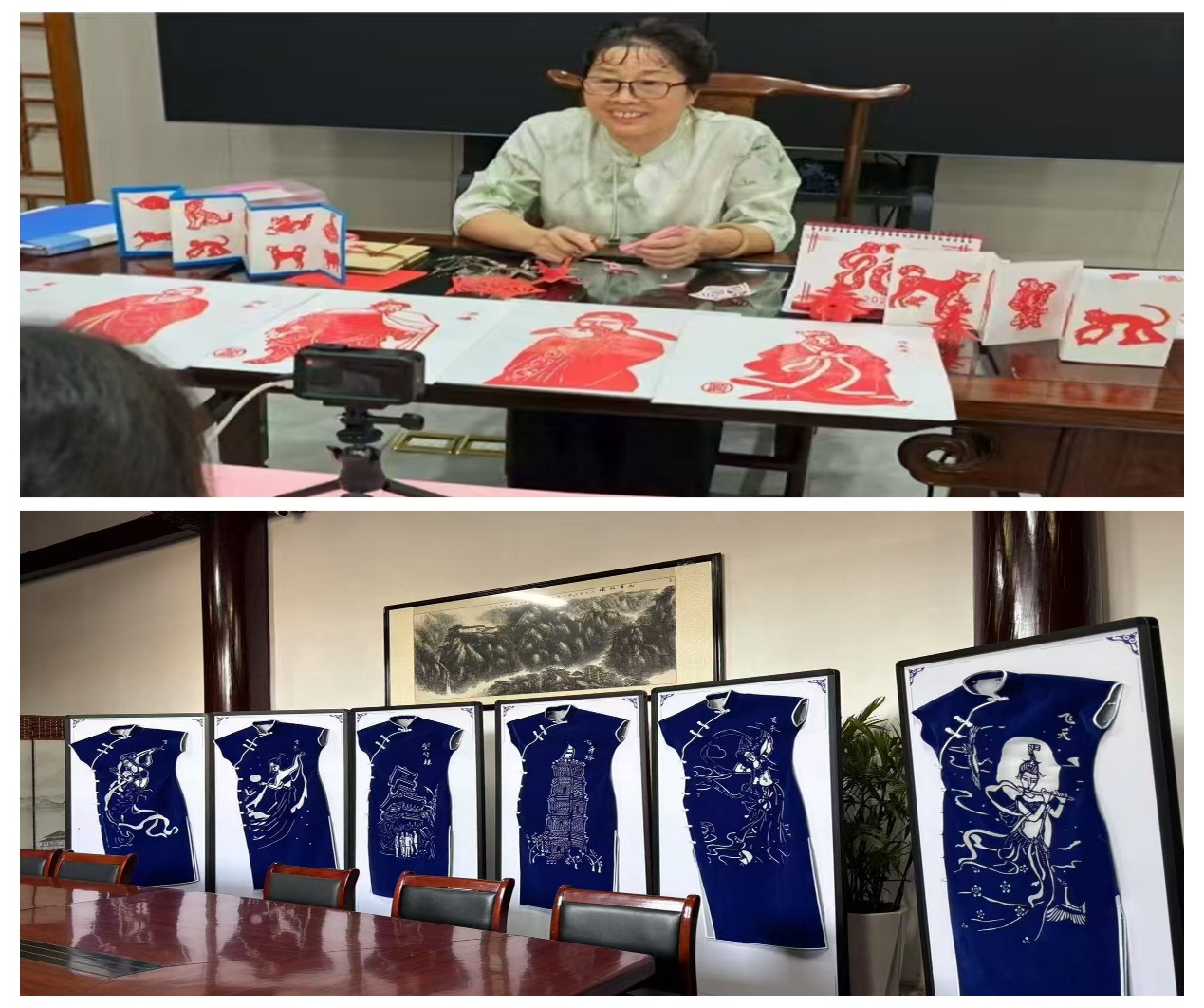 为探索剪纸的当代表达,实践团联合当地博物馆开展非遗创新设计调研。成员们考察池州生态景区、古村落,从杜老师的作品中寻找灵感——秋浦河波纹、九华山云雾等元素跃然纸上,其设计的“剪纸旗袍”已被博物馆收藏。实践团提出将剪纸融入文创产品的设想,如设计“剪纸灯”。在后续专访中,杜小红老师深入剖析了剪纸技艺面临的挑战与发展路径,表示想要剪纸得到传承,更想要它有新发展变化,希望青年人为剪纸注入年轻活力与大胆创新。