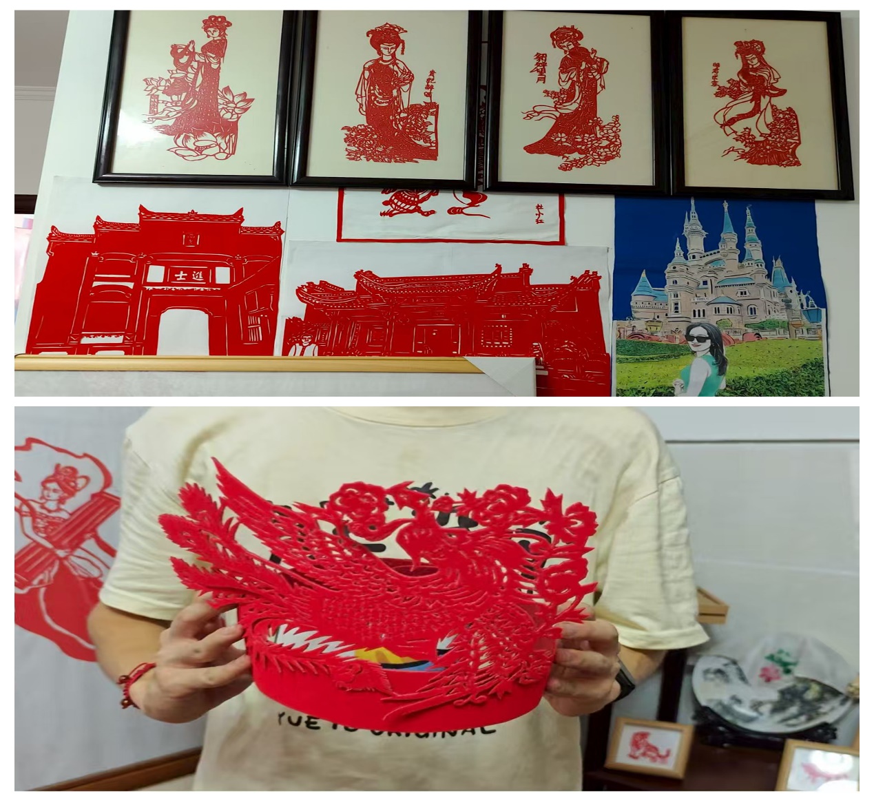 池州剪纸作为省级非物质文化遗产,以其融合江南灵秀与皖地质朴的独特风格闻名,题材多源于山水风光与民俗故事。实践团寻访传承人杜小红。她家中贴满墙壁的精美剪纸令成员们惊叹不已:细如发丝的云纹、薄如蝉翼的花瓣,每一处镂空都凝聚着匠心。杜小红老师表达了对剪纸传承的殷切期望:“我想要剪纸能够发扬出去。”一位跟随杜老师学习剪纸的学生专注练习的身影和杜老师对孩子作品的欣慰笑容,让成员们感受到技艺传承的温度。
