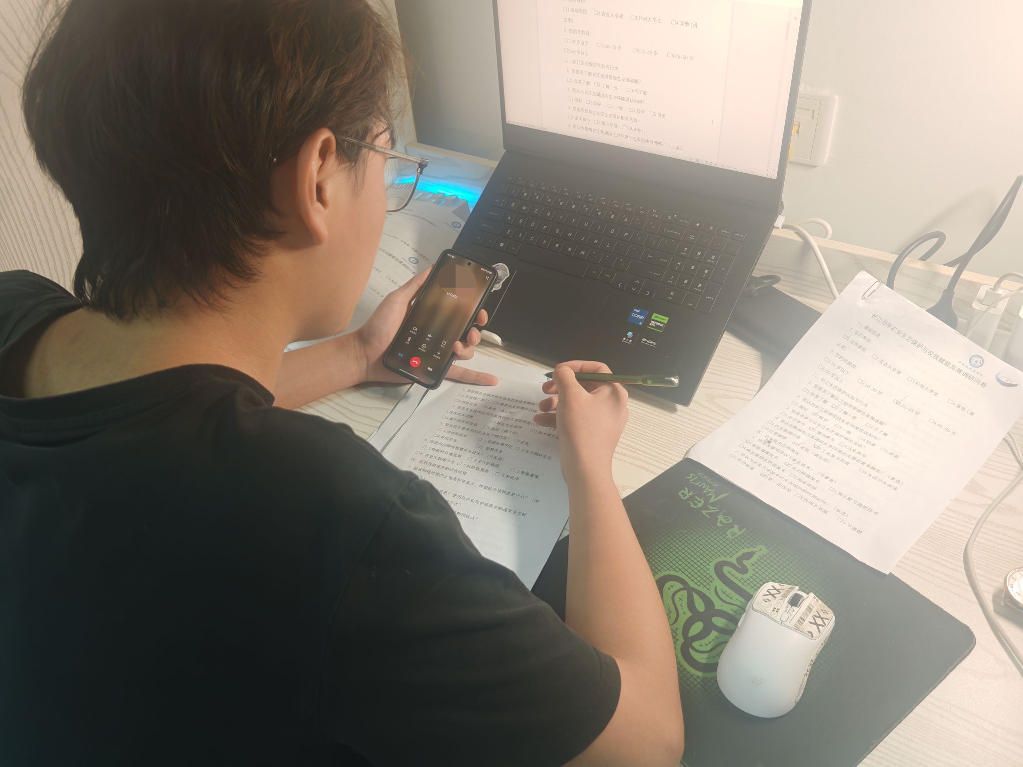 离开长江岸线,实践团队深入二坝镇乡村腹地。农田生态调研是重点,队员们采集土壤样本,记录作物生长状况,围绕农药化肥使用、废弃物处理等议题与农户交流。一位劳作的伯伯坦言:“现在种地讲究科学,尝试减少化肥用量,但有机肥成本高,技术也不够成熟。”这些一线困惑为后续研究指明方向。在村落走访中,队员们挨家挨户开展问卷调查,内容涵盖农村环境治理、垃圾分类、污水处理等热点议题。问卷融合鸠江区龙泉村环保宣传经验,用通俗语言和直观案例确保村民准确表达想法。团队走访蛟矶村村委会,与基层干部交流。通过交流,团队成员意识到:“环保工作最难的是改变习惯,要通过持续宣传和示范引领,让村民从‘要我环保’转变为‘我要环保’”。